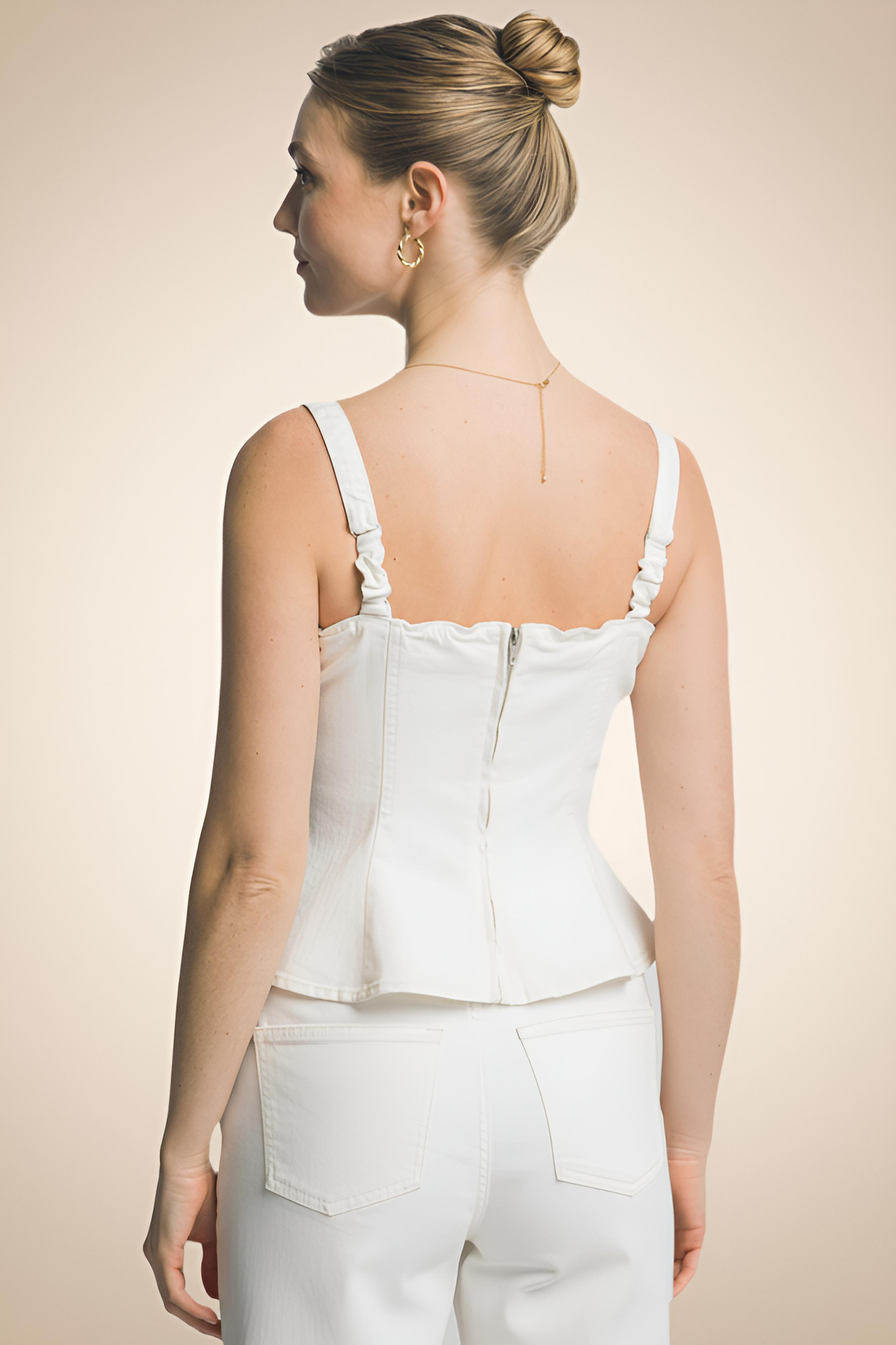 A women’s top featuring a minimalist and elegant design, crafted from a soft, structured fabric that flatters and enhances the silhouette. It features a straight neckline and slender straps, lending a modern and sophisticated style that is ideal for creating clean, polished looks.